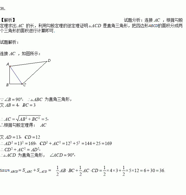如图,四边形ABCD中,∠ABC=90°,AB=4,BC=3,CD=12, AD=13.求四边形ABCD的面积.