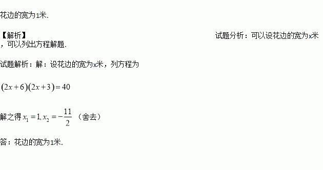 如图①,在一幅矩形地毯的四周镶有宽度相同的边.如图②,地毯中央的矩形图案长6米、宽3米,整个地毯的面积是40平方米.求花边的宽