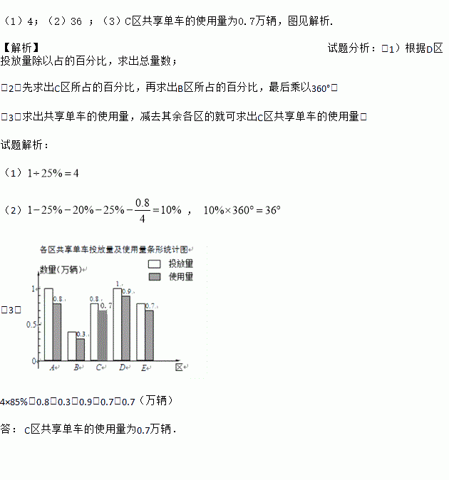 (3)该公司在全市投放的共享单车的使用量占投放量的85%,请计算C区共享单车的使用量并补全条形统计图.