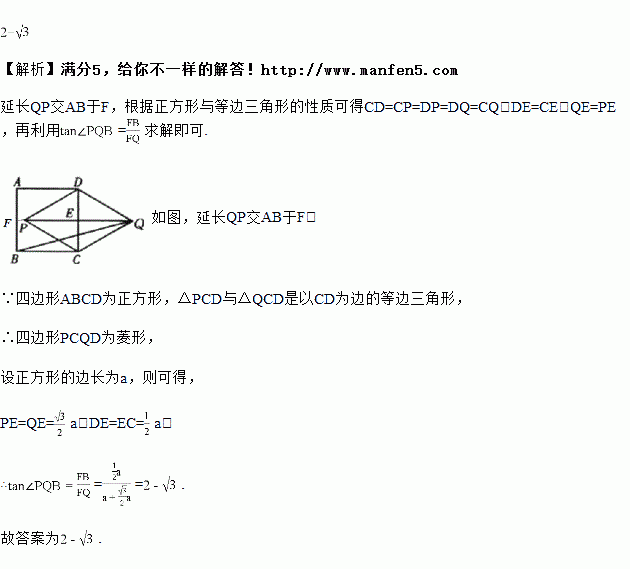 如图,已知ABCD是正方形,以CD为一边向CD两旁作等边三角形PCD和等边三角形QCD,那么的值为_________。