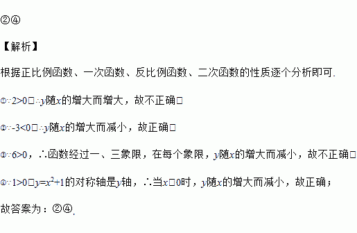 在下列四个函数①y=2x;②y=﹣3x﹣1;③y=;④y=x2+1(x<0)中,y随x的增大而减小的有________(填序号).