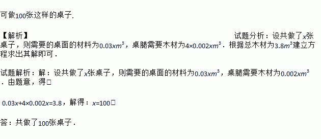 可做100张这样的桌子. 【解析】试题分析:设共做了x张桌子,则需要的桌面的材料为0.03xm3,桌腿需要木材为4×0.002xm3.根据总木材为3.8m3建立方程求出其解即可. 试题解析:【解析】 设共做了x张桌子,则需要的桌面的材料为0.03xm3,桌腿需要木材为0.002xm3.由题意,得: 0.03x+4×0.002x=3.8,解得:x=100. 答:共做了100...