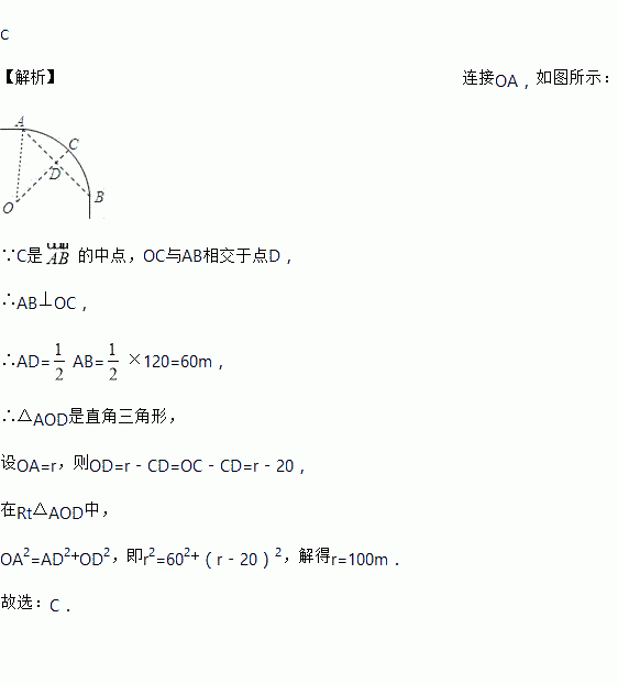 一条公路弯道处是一段圆弧弧AB,点O是这条弧所在圆的圆心,点C是弧AB的中点,OC与AB相交于点D.已知AB=120m,CD=20m,那么这段弯道的半径为( )