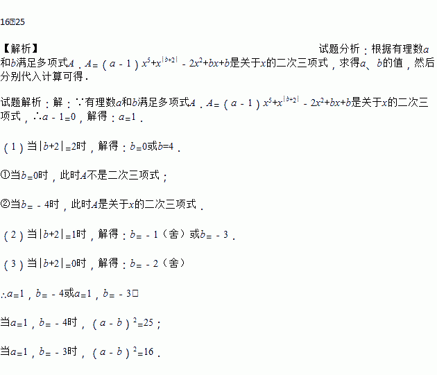 已知有理数a和b满足多项式A,且A=(a﹣1)x5+x|b+2|﹣2x2+bx+b(b≠﹣2)是关于x的二次三项式,求(a﹣b)2的值.
