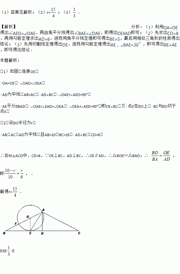 如图,在△ABC中,AB=AC,AD为△ABC的中线,O为AB上一点,以O为圆心,AO为半径的⊙O与AB交于点F,与BC交于点E.连接AE,AE平分∠BAD.