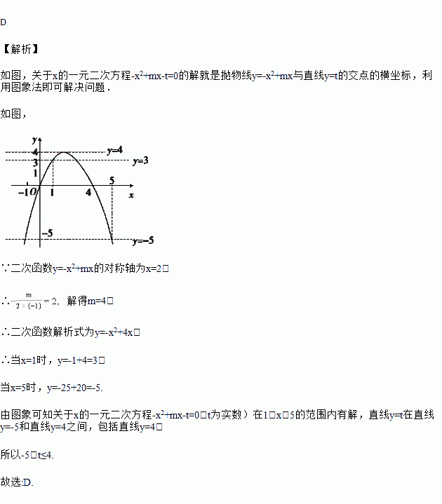 二次函数y=﹣x2+mx的图象如图,对称轴为直线x=2,若关于x的一元二次方程﹣x2+mx﹣t=0(t为实数)在1<x<5的范围内有解,则t的取值范围是( )
