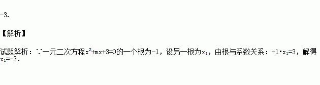 一元二次方程x2+mx+3=0的一个根为- 1,则另一个根为 .