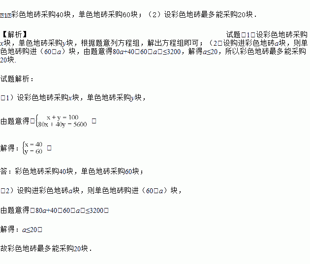 小武新家装修,在装修客厅时,购进彩色地砖和单色地砖共100块,共花费5600元.已知彩色地砖的单价是80元/块,单色地砖的单价是40元/块.