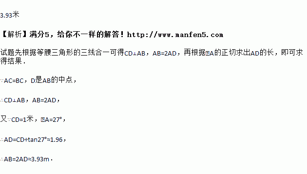 某校自行车棚的人字架棚顶为等腰三角形,D是AB的中点,中柱CD=1米,∠A=27°,