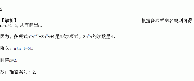 多项式anbn+1+3a3b+1是5次3项式,n=__________。