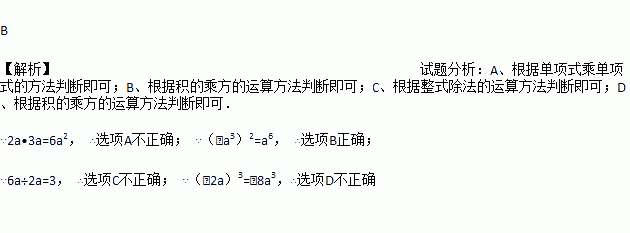 A. 2a•3a=6a B. (﹣a3)2=a6 C. 6a÷2a=3a D. (﹣2a)3=﹣6a3