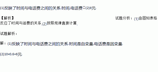 (1)反映了时间与电话费之间的关系.时间,电话费;(2)6元. 【解析】试题分析:(1)由图知表格反应了时间与话费的关系.(2)按照规律直接计算. 试题解析: 【解析】 (1)反映了时间与电话费之间的关系.时间是自变量,电话费是因变量. (2)10×0.6=6元.