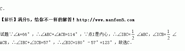 如图,在△ABC中,∠A=66°,点I是内心,则∠BIC的大小为( )