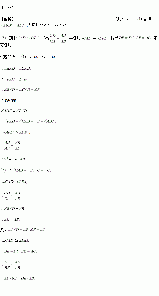 如图,已知在△ABC中,∠BAC =2∠B,AD平分∠BAC,DF//BE,点E在线段BA的延长线上,联结DE,交AC于点G,且∠E =∠C.