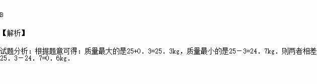 某粮店出售的三种品牌的面粉袋上分别标有质量为(25±0.1)kg,(25±0.2)kg, (25±0.3)kg的字样,从中任意拿出两袋,它们的质量最多相差 ( )