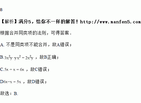 A. 3a+2b=5ab B. 3x2y-yx2=2x2y C. 5x+x=5x2 D. 6x-x=6