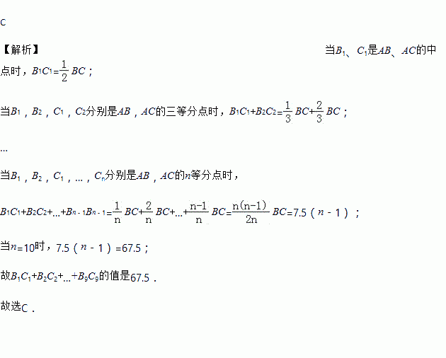 如图,在△ABC中,BC=15,B1、B2、…B9、C1、C2、…C9分别是AB、AC的10等分点,则B1C1+B2C2+…+B9C9的值是( )
