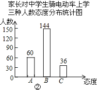 13£®ÑïÖÝÊÐÖÐѧÉúÆïµç¶¯³µÉÏѧµÄÏÖÏóÔ½À´Ô½Êܵ½Éç»áµÄ¹Ø×¢£®ÎÒÊмÇÕßËæ»úµ÷²éÁËһЩ¼Ò³¤¶ÔÕâÖÖÏÖÏóµÄ̬¶È£¨A£ºÎÞËùν£»B£º·´¶Ô£»C£ºÔ޳ɣ©£¬²¢½«µ÷–˽á¹û»æÖƳÉͼ¢ÙºÍͼ¢ÚµÄͳ¼ÆÍ¼£¨²»ÍêÕû£©£®Çë¸ù¾ÝͼÖÐÌṩµÄÐÅÏ¢£¬½â´ðÏÂÁÐÎÊÌ⣺£¨1£©ÔÚͼ¢ÙÖУ¬A²¿·ÖËùÕ¼ÉÈÐεÄÔ²ÐĽǶÈÊýΪ90¡ã£»