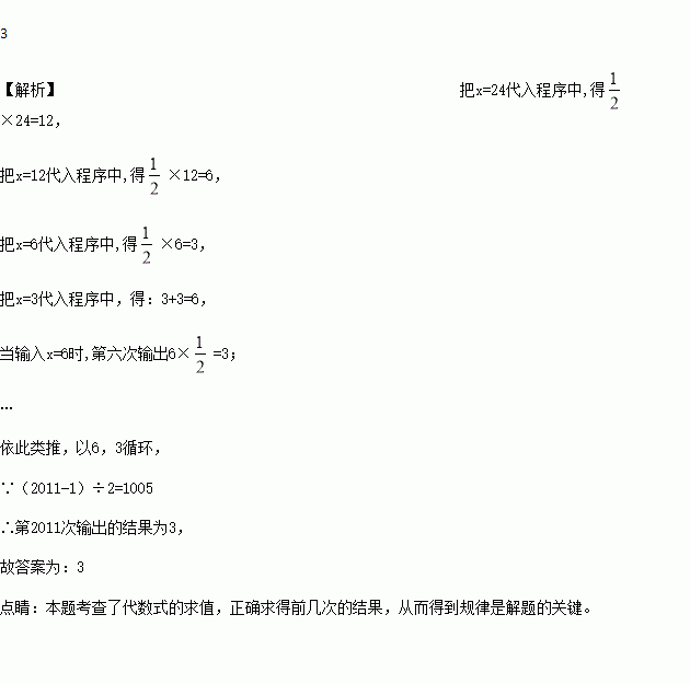如图所示的运算程序中,若开始输入的x值为24,我们发现第1次输出的结果为 12,第2次输出的结果为6,……第2011次输出的结果为____.