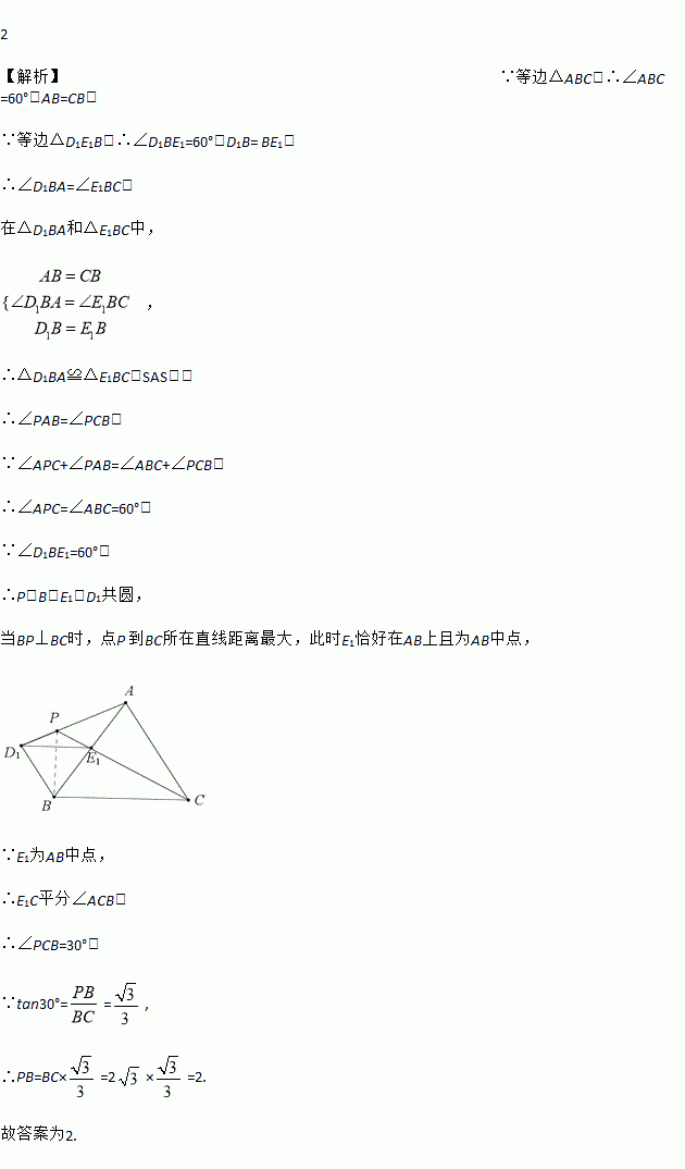 , D,E分别是AB,BC的中点(如图).若将△BDE绕点B逆时针旋转,得到△BD1E1,设旋转角为α(0°<α<180°),记射线CE1与AD1的交点为P.点P到BC所在直线的距离的最大值为_____________.