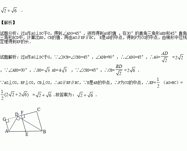 一副三角板按如图方式摆放,得到△ABD和△BCD,其中∠ADB=∠BCD=90°,∠A=60°,∠CBD=45°.E为AB的中点,过点E作EF⊥CD于点F.若AD=4cm,则EF的长为 .