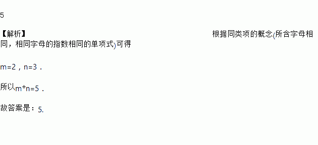 5 【解析】根据同类项的概念(所含字母相同,相同字母的指数相同的单项式)可得 m=2,n=3. 所以m+n=5. 故答案是:5.