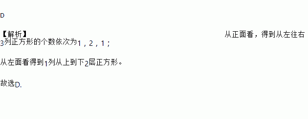 D 【解析】从正面看,得到从左往右3列正方形的个数依次为1,2,1; 从左面看得到1列从上到下2层正方形。 故选D.