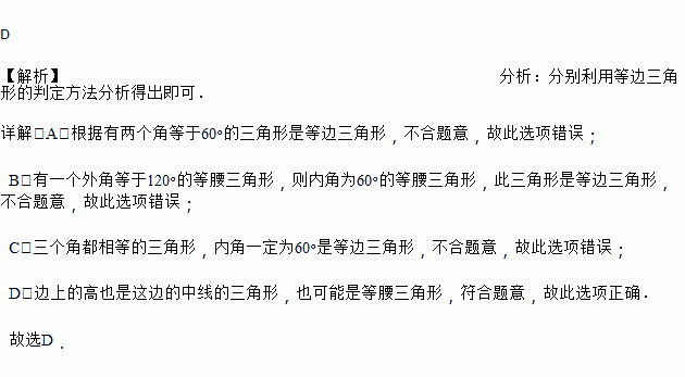 A. 有两个角等于60°的三角形 B. 有一个外角等于120°的等腰三角形