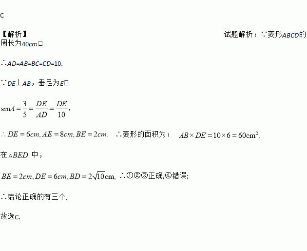 C 【解析】试题解析:∵菱形ABCD的周长为40cm, ∴AD=AB=BC=CD=10. ∵DE⊥AB,垂足为E, ∴菱形的面积为: 在中, ∴①②③正确,④错误; ∴结论正确的有三个. 故选C.为执行“均衡教育”政策,某县2014年投入教育经费2500万元,预计到2016年底三年累计投入