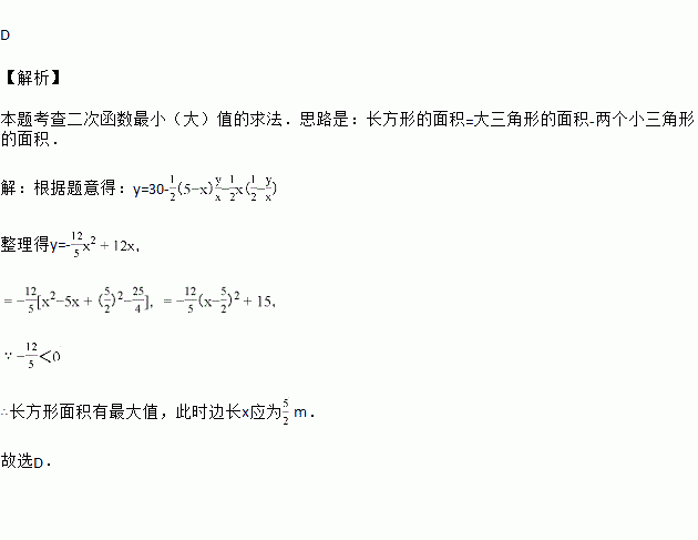 如图所示,在一个直角三角形的内部作一个长方形ABCD,其中AB和BC分别在两直角边上,设AB=xm,长方形的面积为ym2, 要使长方形的面积最大,其边长x应为( )