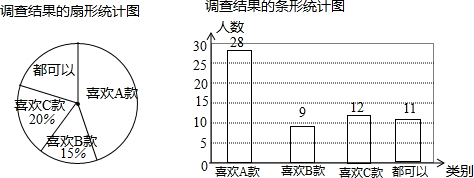·ÖÎö £¨1£©¹Û²ìͳ¼ÆÍ¼£¬ÀûÓÃϲ»¶C¿îµÄÈËÊý³ýÒÔËüËùÕ¼µÄ°Ù·Ö±È¼´¿ÉµÃµ½µ÷²éµÄ×ÜÈËÊý£¬½øÒ»²½ÇóµÃϲ»¶B¿îµÄÈËÊýºÍ¶¼¿ÉÒÔµÄÈËÊý£»µÃµ½¡°¶¼¿ÉÒÔ¡±µÄÈËÊý£¬ÔÙ¼ÆËã³öËüËùÕ¼µÄ°Ù·Ö±È£¬ÓÃ360¡ã³ËÒÔ¡°¶¼¿ÉÒÔ¡±µÄ°Ù·Ö±È¼´¿ÉÇóµÃËùÕ¼Ô²ÐĽǵĶÈÊý£»È»ºó²¹È«ÌõÐÎͳ¼ÆÍ¼£»
