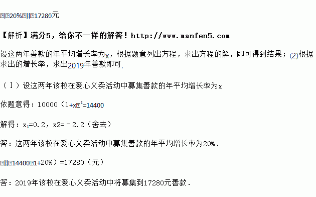 Ϊ¼ùÐÐÖлªÃñ×åµÄ´«Í³ÃÀµÂ£¬ÅàÑøÑ§ÉúÀÖÓÚÖúÈË¡¢ÎÞ˽·îÏ׵ľ«Éñ£¬½ü¼¸ÄêijУ¶¼ÔÚ3Ô·ݾÙÐС°Ñ§À׷桱°®ÐÄÒåÂô»î¶¯£¬²¢½«ËùµÃÉÆ¿îÈ«²¿×ÊÖú¼ÒÍ¥À§ÄÑѧÉú£®¾ÝϤͨ¹ý¸Ã»î¶¯Ä¼¼¯µ½µÄÉÆ¿îÖðÄêÔö¼Ó£¬2016Äê=ɯ¿î10000Ôª£¬2018Äê=ɯ¿î14400Ôª£®
