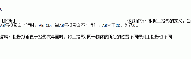C 【解析】试题解析:根据正投影的定义,当AB与投影面平行时,AB=CD,当AB与投影面不平行时,AB大于CD.故选C. 点睛:投影线垂直于投影底幕面时,称正投影. 同一物体的所处的位置不同得到正投影也不同.若反比例函数y=