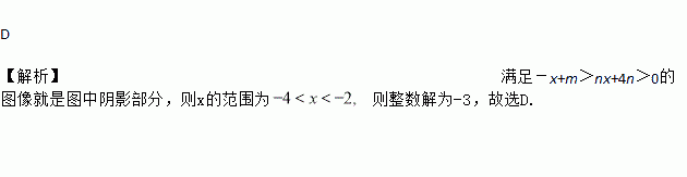 如图,直线y=-x+m与y=nx+4n(n≠0)的交点的横坐标为-2,则关于x的不等式-x+m>nx+4n>0的整数解为( )