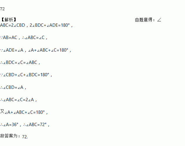 72 【解析】由题意得:∠ABC=2∠CBD,2∠BDC+∠ADE=180°, ∵AB=AC,∴∠ABC=∠C, ∵∠ADE=∠A,∠A+∠ABC+∠C=180°, ∴∠BDC=∠C=∠ABC, ∵∠CBD+∠C+∠BDC=180°, ∴∠CBD=∠A, ∴∠ABC=∠C=2∠A, 又∠A+∠ABC+∠C=180°, ∴∠A=36°,∴∠ABC...