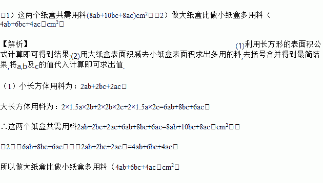 (1)用a、b、c的代数式表示做这两个纸盒共需用料多少cm2.