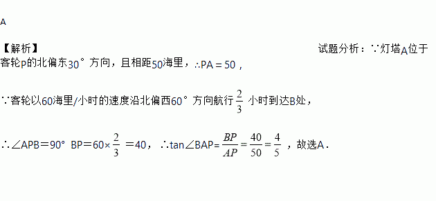 小时到达B处,那么tan∠BAP=( )