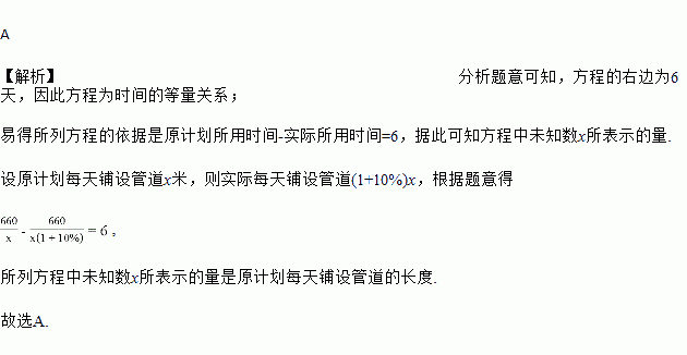 长春市市政工程中需要铺设一条长660米的管道,为了尽量减少施工对城市交通造成的影响,实际施工时,每天铺设管道的长度比原计划增加10%,结果提前6天完成,求实际每天铺设管道的长度与实际施工天数.某同学根据题意列出方程
