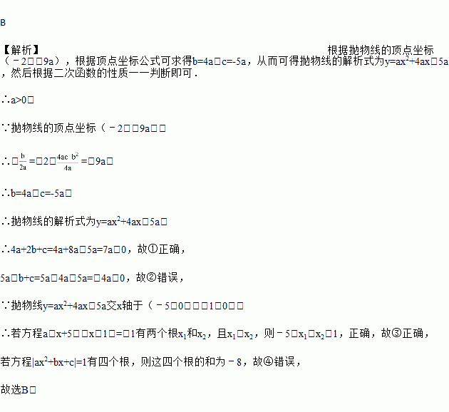 二次函数y=ax2+bx+c(a≠0)的大致图象如图所示,顶点坐标为(﹣2,﹣9a),下列结论:①4a+2b+c>0;②5a﹣b+c=0;③若方程a(x+5)(x﹣1)=﹣1有两个根x1和x2,且x1<x2,则﹣5<x1<x2<1;④若方程|ax2+bx+c|=1有四个根,则这四个根的和为﹣4.其中正确的结论有( )