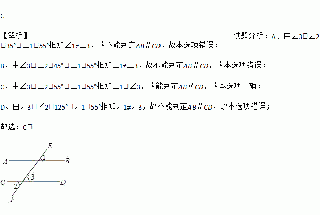 如图,直线AB,CD被直线EF所截,∠1=55°,下列条件中能判定AB∥CD的是( )