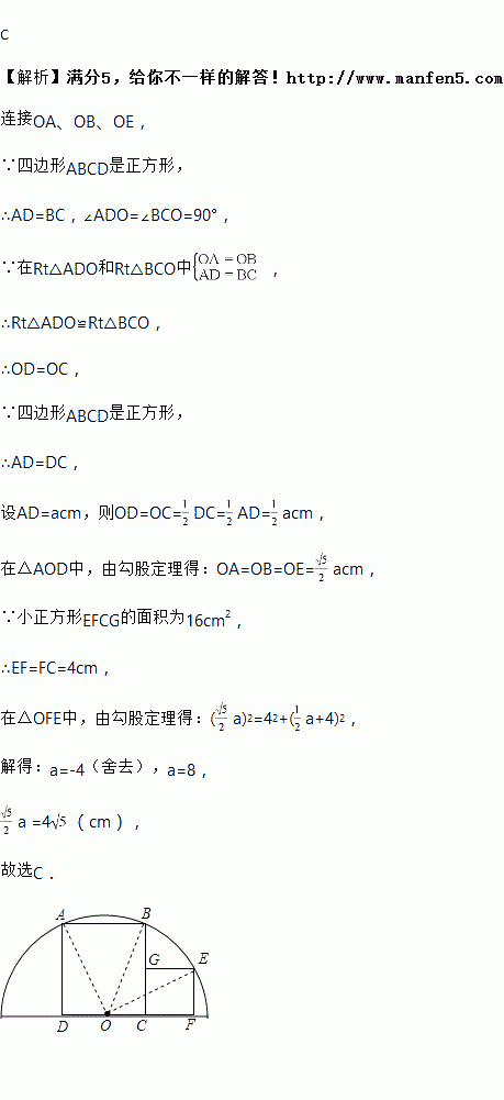 如图,两正方形彼此相邻且内接于半圆,若小正方形的面积为16cm2,则该半圆的半径为()