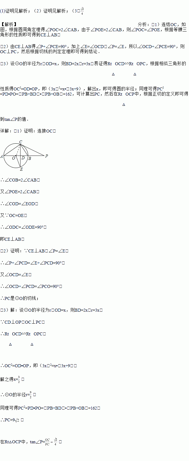 如图,已知,AB是⊙O的直径,点P在AB的延长线上,弦CE交AB于点,连结OE,AC,且∠P=∠E,∠POE=2∠CAB.