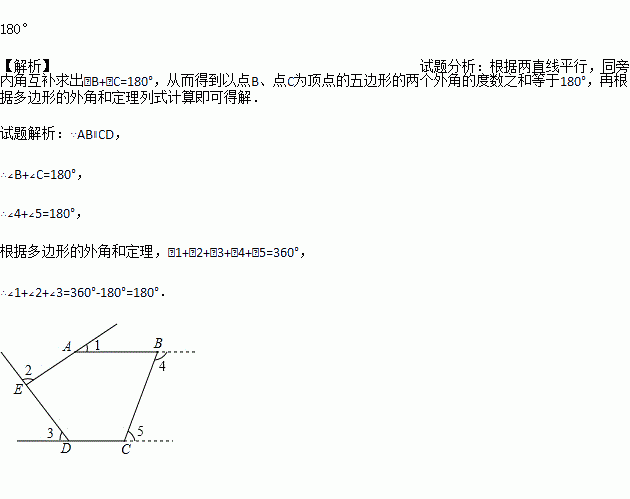 如图,五边形ABCDE中,AB∥CD,∠1、∠2、∠3分别是∠BAE、∠AED、∠EDC的外角,则∠1+∠2+∠3=___________.
