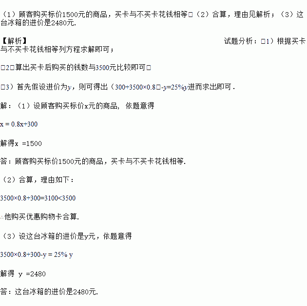 (1)顾客购买标价1500元的商品,买卡与不买卡花钱相等;(2)合算,理由见解析;(3)这台冰箱的进价是2480元. 【解析】试题分析:(1)根据买卡与不买卡花钱相等列方程求解即可; (2)算出买卡后购买的钱数与3500元比较即可; (3)首先假设进价为y,则可得出(300+3500×0.8)-y=25%y进而求出即可. 【解析】 (1)设顾客购买标价x元的商品, 依题意...