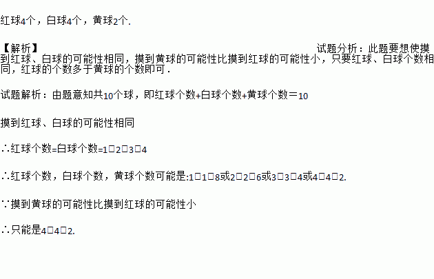 用十个球设计一个游戏,使摸到红球、白球的可能性相同,并且摸到黄球的可能性比摸到红球的可能性小.