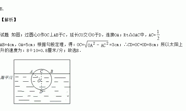 如图是一位同学从照片上剪切下来的画面,“图上”太阳与海平线交于A、B两点,他测得“图上”圆的半径为5厘米,AB=8厘米,若从目前太阳所处位置到太阳完全跳出海面的时间为10分钟,则“图上”太阳升起的平均速度为( )