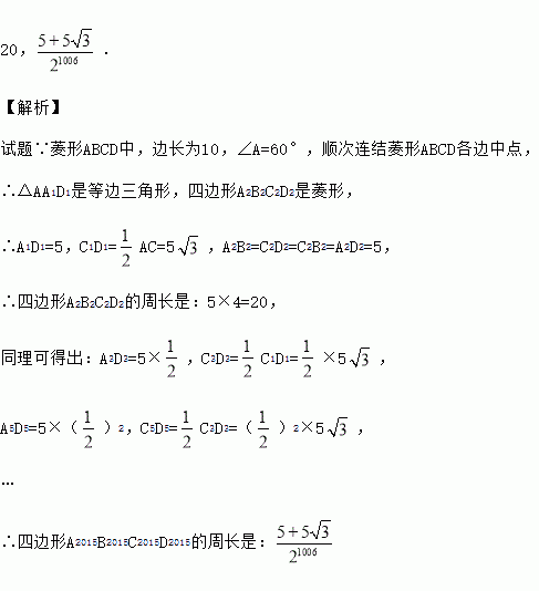 如图,在菱形ABCD中,边长为10,∠A=60°,顺次连接菱形ABCD各边中点,可得四边形A1B1C1D1;顺次连结四边形A1B1C1D1各边中点,可得四边形A2B2C2D2;顺次连结四边形A2B2C2D2各边中点,可得四边形A3B3C3D3;按此规律继续下去….则四边形A2B2C2D2的周长是 ;四边形A2015B2015C2015D2015的周长 .