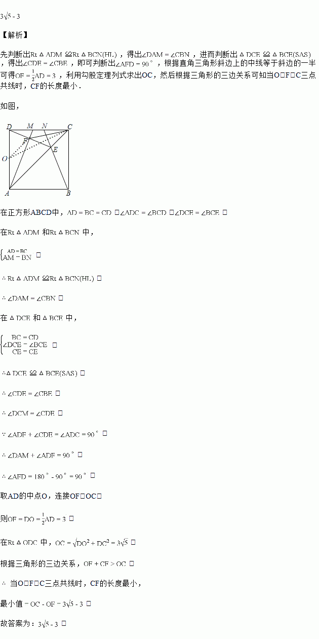 如图,M、N是正方形ABCD的边CD上的两个动点,满足,连接AC交BN于点E,连接DE交AM于点F,连接CF,若正方形的边长为6,则线段CF的最小值是______.