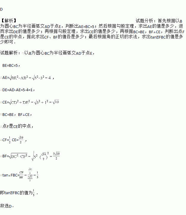如图,在矩形ABCD中,AB=3,BC=5,以B为圆心BC为半径画弧交AD于点E,连接CE,作BF⊥CE,垂足为F,则tan∠FBC的值为( )