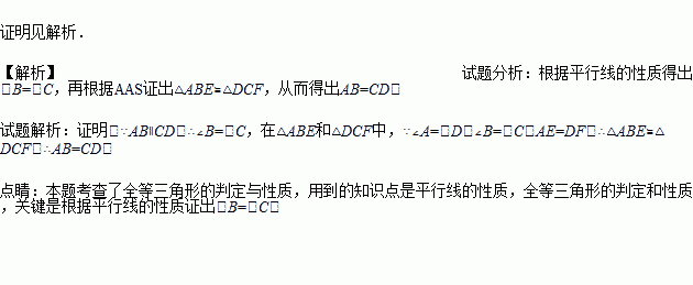 如图,点C,E,F,B在同一直线上,AB∥CD,AE=DF,∠A=∠D.